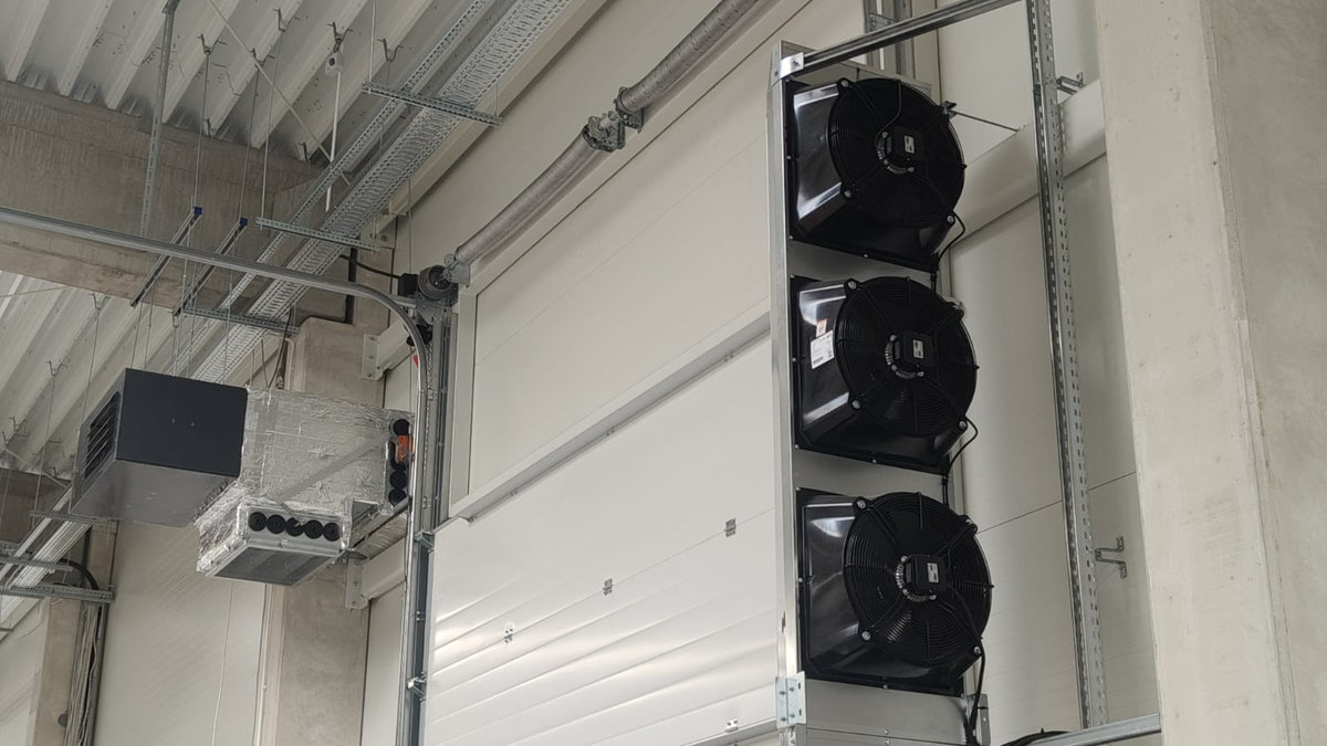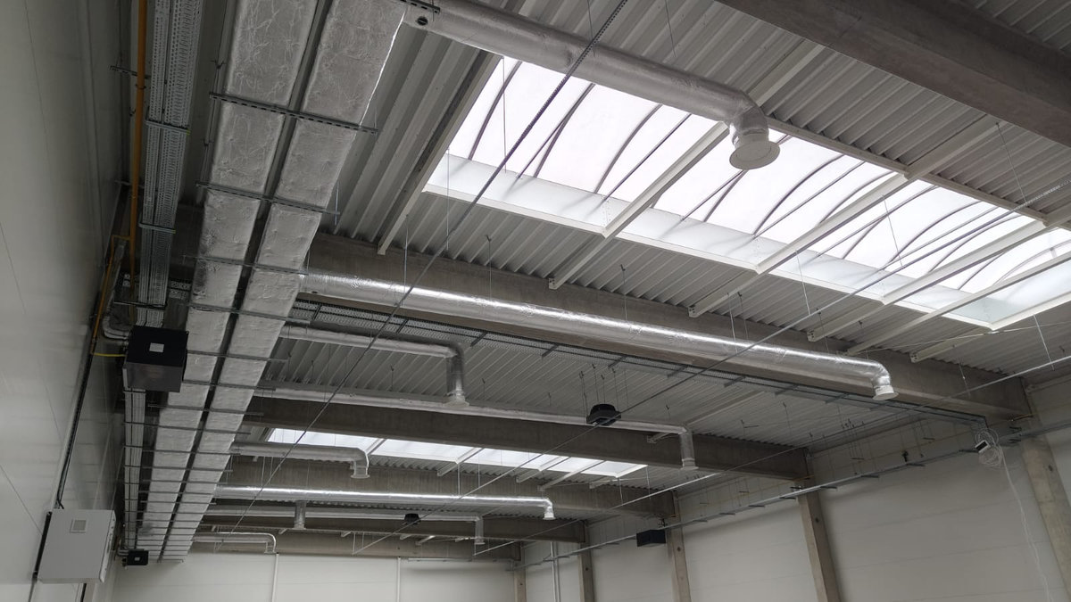 Wentylacja mechaniczna hali oparta jest na nawiewie i wywiewie powietrza z centrali wentylacyjnej z nagrzewnicą gazową prod. KLIMOR. Ogrzewanie hali realizowane jest za pomocą aparatów grzewczych gazowych, częściowo z komorą mieszania oraz destryfikatorów (prod. SCHWANK) mających na celu zwiększenie efektywności pracy układu. W hali zamontowaliśmy także kurtyny zimne przy drzwiach wejściowych i bramach wjazdowych (prod. SCHWANK).